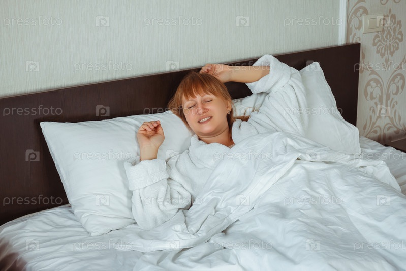 Женщина в белом халате спит на большой кровати и видит счастливый сон