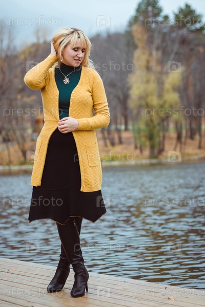 Молодая женщина осенью на пирсе смотрит вниз и поправляет волосы