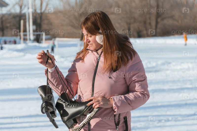 Женщина в розовом пуховике смотрит на черные коньки, которые она держит в руках на фоне катка