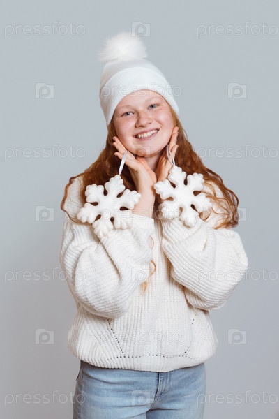 Радостная девочка с рыжими волосами в белом свитере и шапке держит снежок