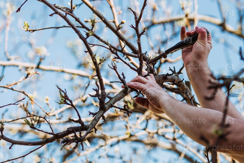 Обрезка ветвей плодового дерева секатором и садовыми ножницами. Инструмент в руках человека. Распиловка древесины, уход за древесиной. Садоводство. Подготовка сада к летнему сезону