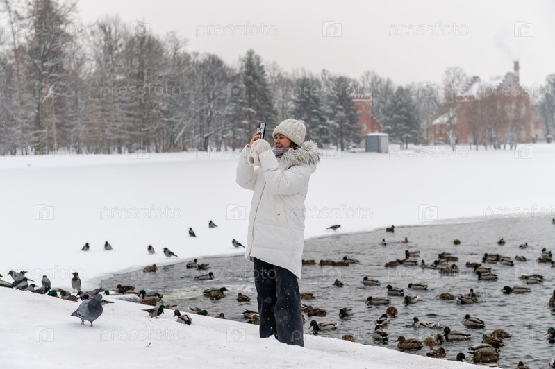 Россия, Санкт-Петербург, январь 2024 г.: Девушка делает селфи на фоне озера с утками в зимнем парке