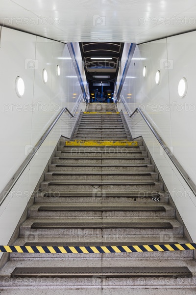 Лестница, ведущая вниз к станции метро с предупреждающей разметкой