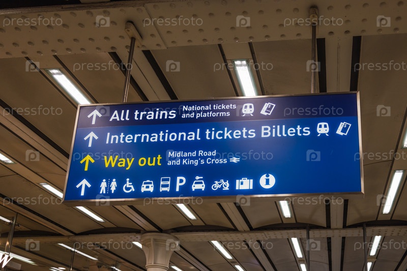 Синий указатель на вокзале Сент-Панкрас, показывающий прибытие, международные поезда и удобства