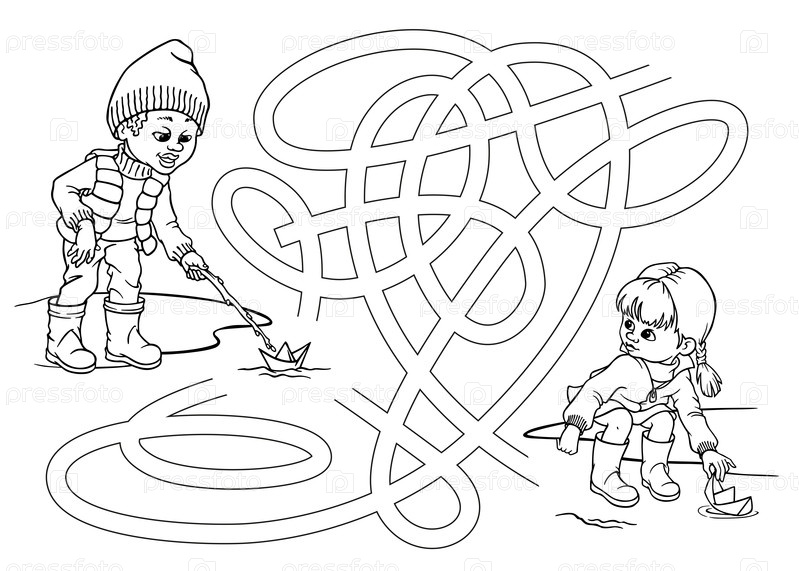 Дети запускают бумажные кораблики в луже. Черно-белый лабиринт с мальчиком и девочкой в весенней одежде. Сезонная дошкольная распечатка. Игры на свежем воздухе, лабиринт или раскраска. Образовательный рабочий лист