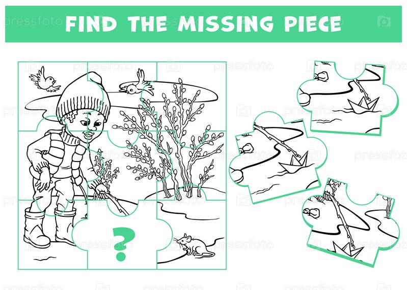 Логическая игра для детей и взрослых с мальчиком, запускающим бумажный кораблик в ручей. Страница для детской головоломки. Задание на внимательность. Развитие пространственного мышления. Контурный векторный весенний пейзаж