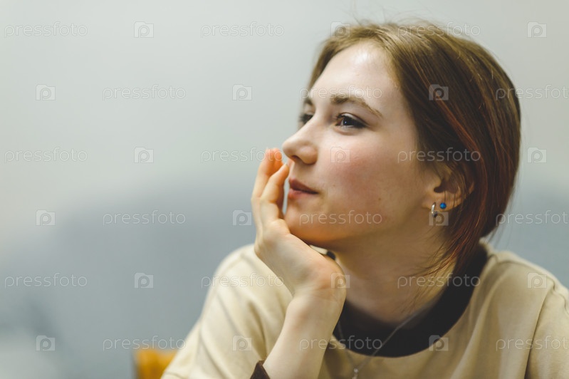 Красивая девушка задумчиво смотрит в сторону и мечтает