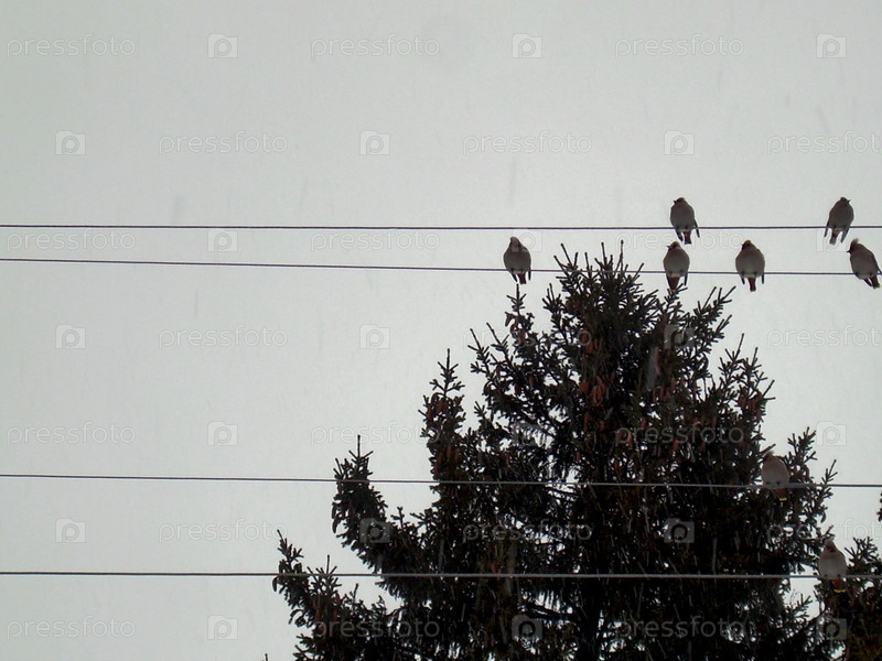 Свиристели сидят на электрических проводах