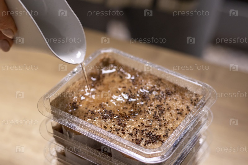 Пластиковые контейнеры с политыми семенами микрозелени, сложенные на джутовых ковриках. Еда