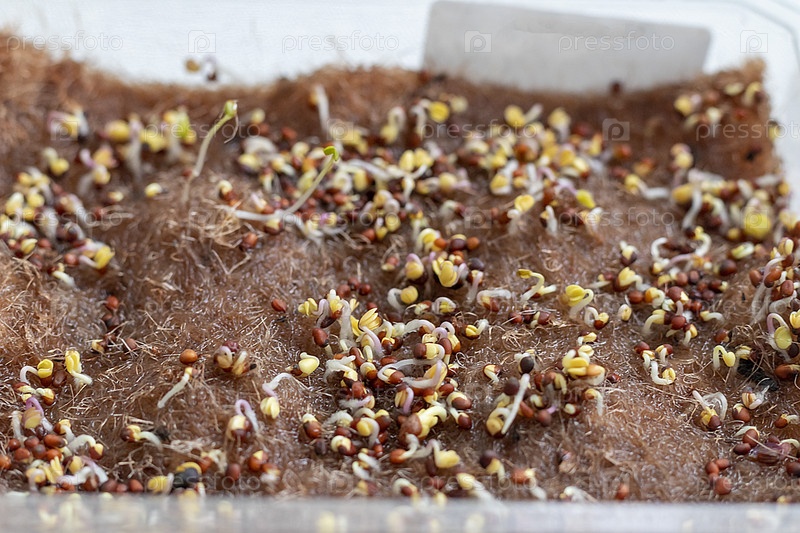 Свежепроросшие ростки микрозелени в пластиковом контейнере на джутовом коврике. Еда
