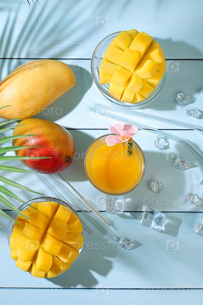 Концепция летней вечеринки. Домашний коктейль, сок или лимонад с ломтиками манго и льдом на солнечном кухонном столе. Рецепт освежающего летнего диетического напитка, Детокс-диета и здоровый образ жизни, Меню ресторана