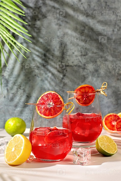 Королевский коктейль из апельсина, кубиков льда, рома и текилы. Летняя вечеринка и концепция релаксации в ресторане. Баннер с бокалами алкогольных напитков и тропических фруктов. Меню для бара или кафе