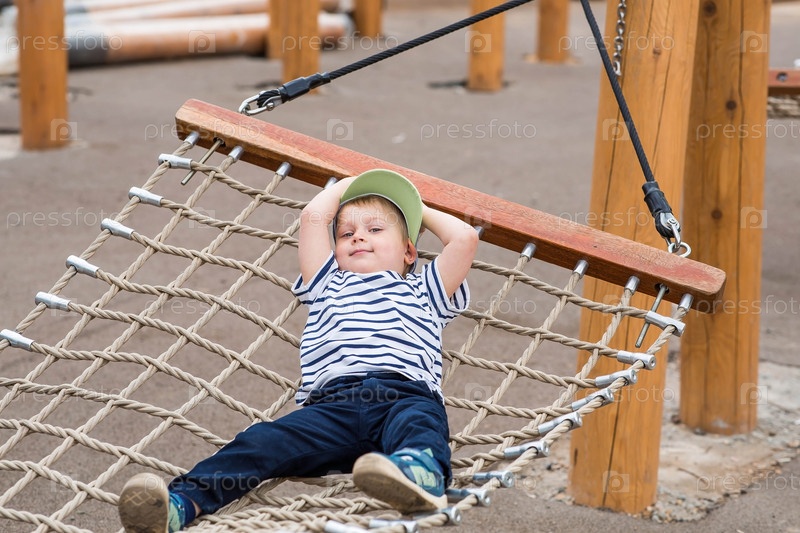 Образ жизни. Милый маленький мальчик лежит в гамаке на современной открытой игровой площадке. Концепция семейного развлечения и досуга
