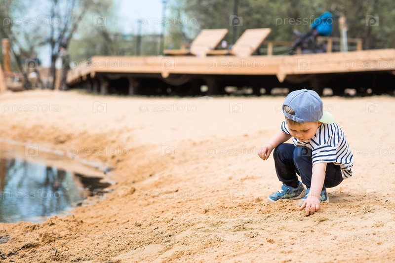Летний образ жизни. Милый маленький мальчик весело играет с песком на пляже у воды. Концепция семейного развлечения и досуга