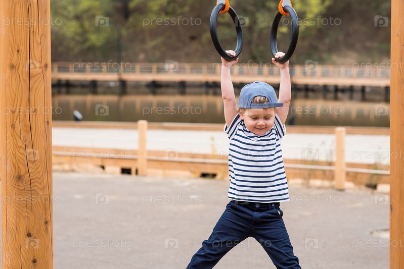 Образ жизни. Милый маленький мальчик висит на кольцах на спортивной площадке на свежем воздухе. Концепция детского спорта и физического развития