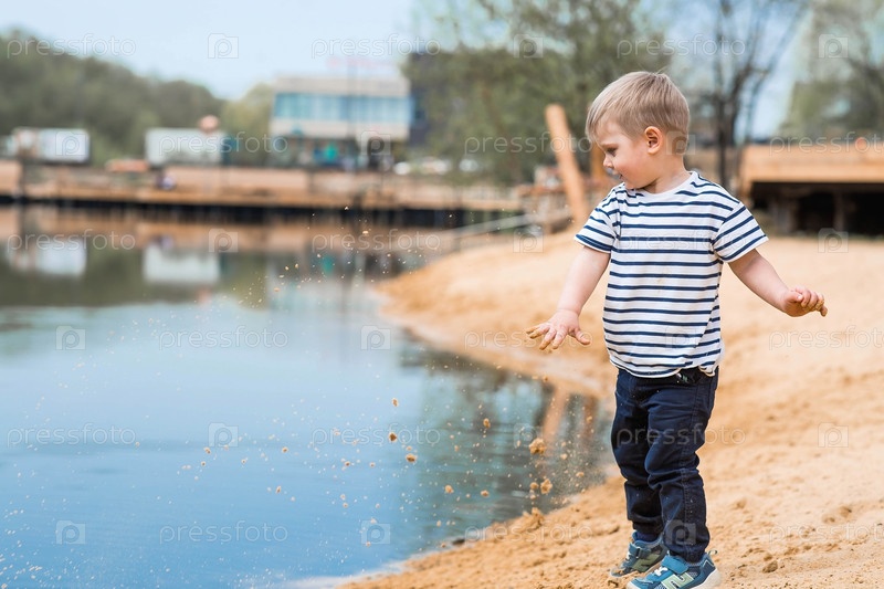 Летний образ жизни. Милый маленький мальчик весело играет с песком на пляже у воды. Концепция семейного развлечения и досуга