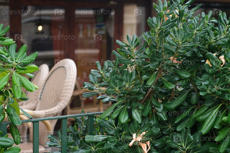 Изолированный фон. Плетеные кресла в уличном кафе и листья магнолии