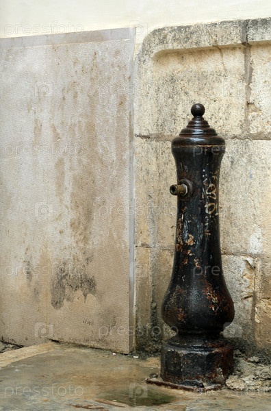 Старинная уличная колонка на фоне каменной стены. Изолированный фон в теплых тонах
