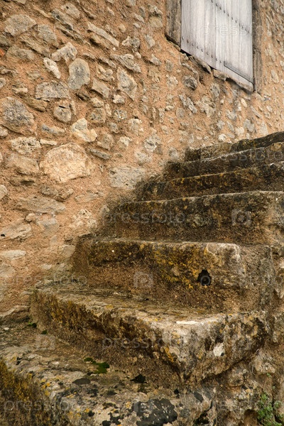 Старый каменный дом, лестница, ведущая наверх. Символический романтический пейзаж