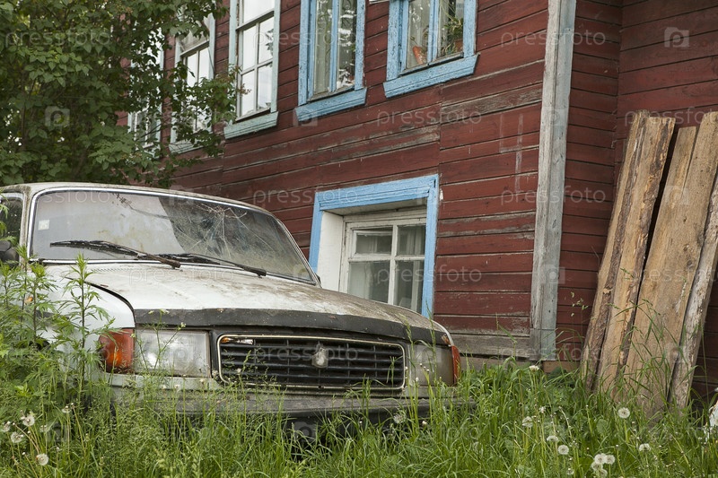 Старая ржавая машина во дворе деревенского дома в зеленой траве