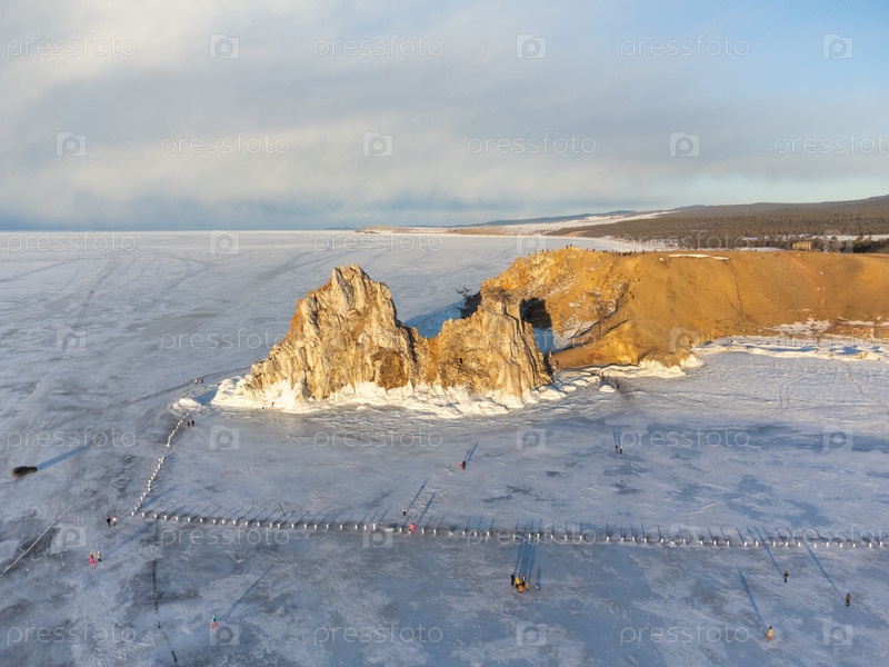 Небо облачное, солнце садится, создавая угрюмую атмосферу. Вид на гору Шаманка, озеро Байкал зимой