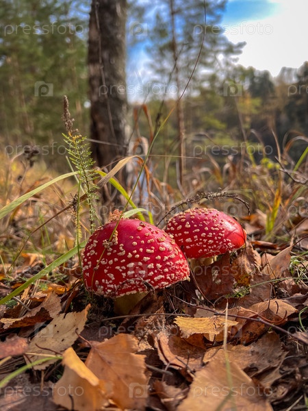 Группа красных и белых грибов растет в траве