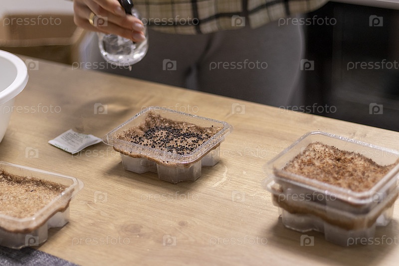 Человек поливает, опрыскивает семена микрозелени в джутовом коврике в пластиковом контейнере. Еда