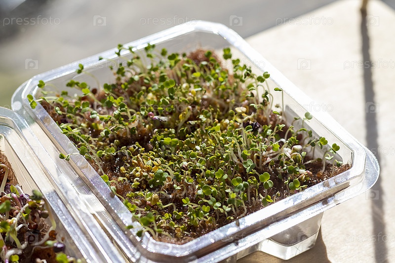 Свежепроросшие ростки микрозелени в пластиковом контейнере на джутовом коврике. Еда