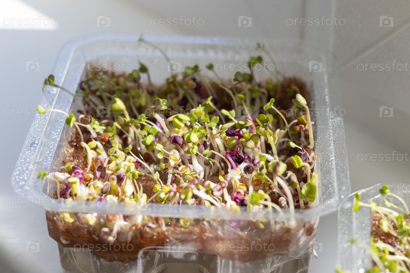 Свежепроросшие ростки микрозелени в пластиковом контейнере на джутовом коврике. Еда