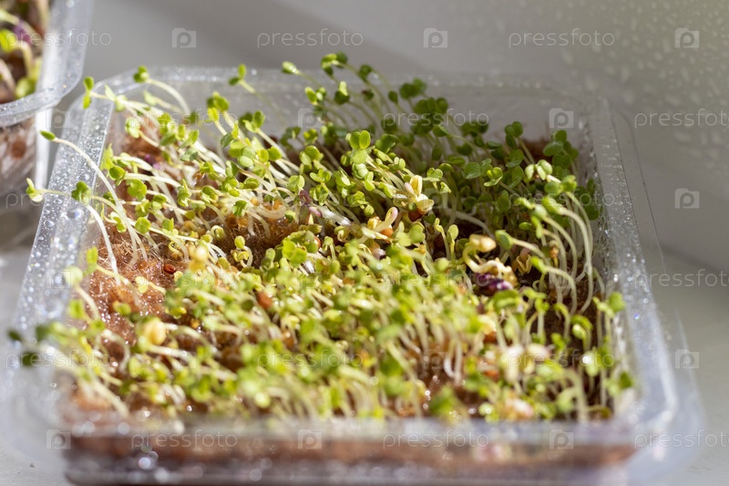 Свежепроросшие ростки микрозелени в пластиковом контейнере на джутовом коврике. Еда