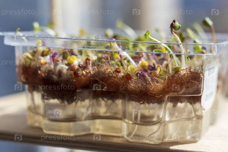 Свежепроросшие ростки микрозелени в пластиковом контейнере на джутовом коврике. Еда