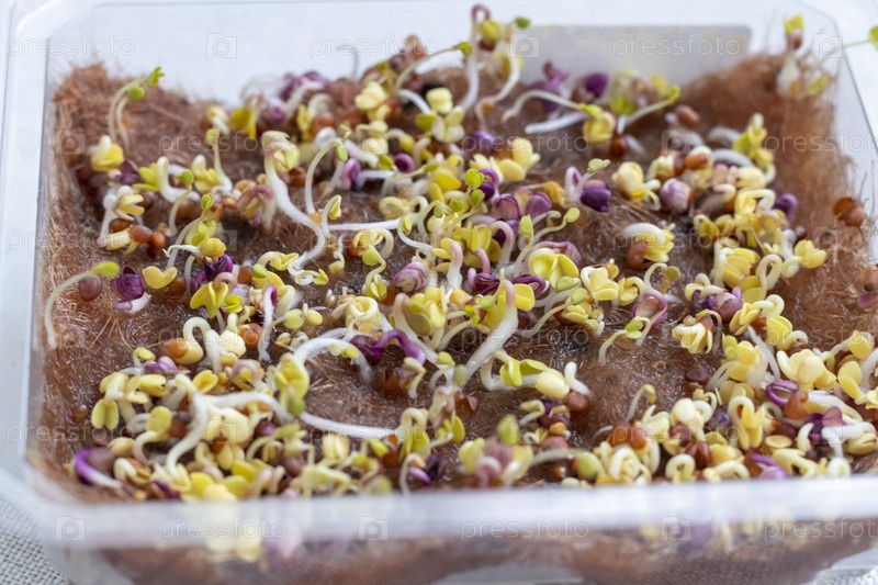 Свежепроросшие ростки микрозелени в пластиковом контейнере. Еда