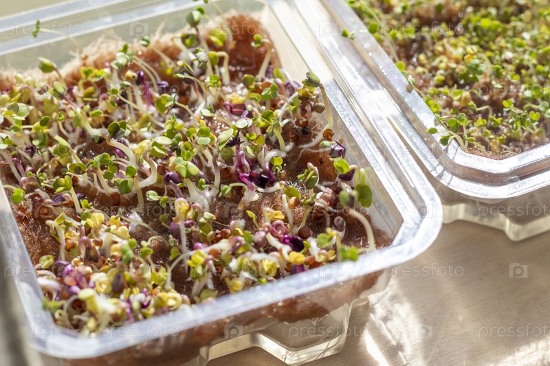 Свежепроросшие ростки микрозелени в пластиковом контейнере на джутовом коврике. Еда