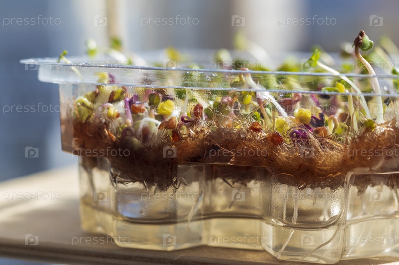 Свежепроросшие ростки микрозелени в пластиковом контейнере на джутовом коврике. Еда