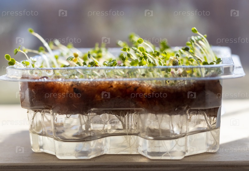 Свежепроросшие ростки микрозелени в пластиковом контейнере на джутовом коврике. Еда