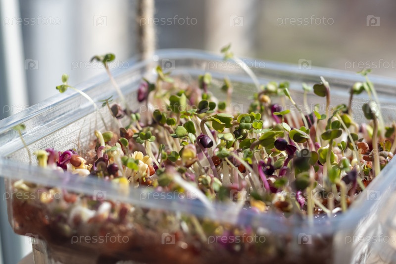 Свежепроросшие ростки микрозелени в пластиковом контейнере на джутовом коврике. Еда