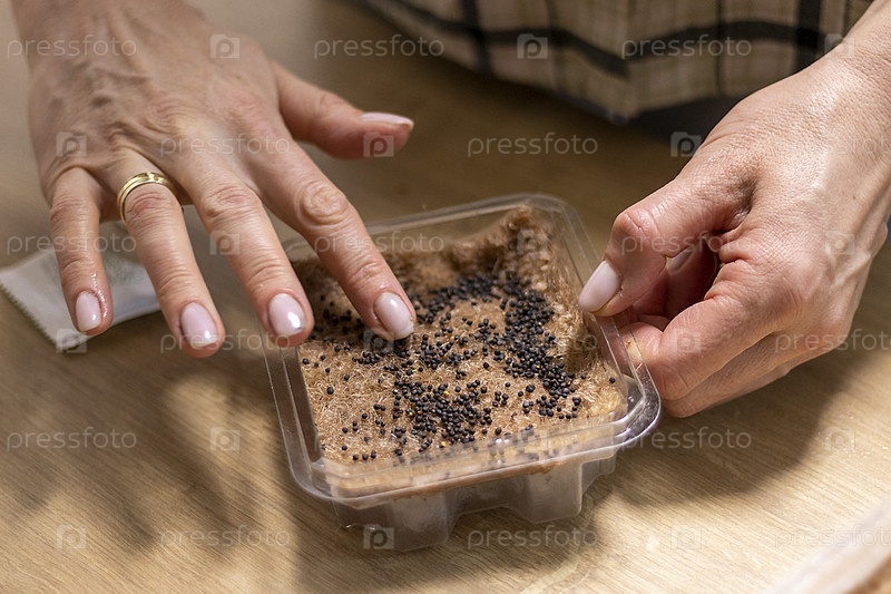 Человек сажает семена микрозелени на джутовый коврик. Хобби