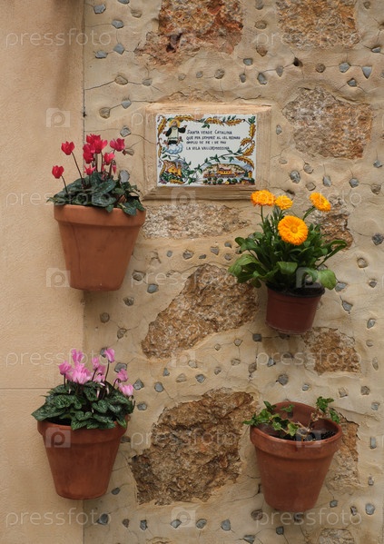 Изолированный фон. Старая каменная стена дома с цветами в горшках