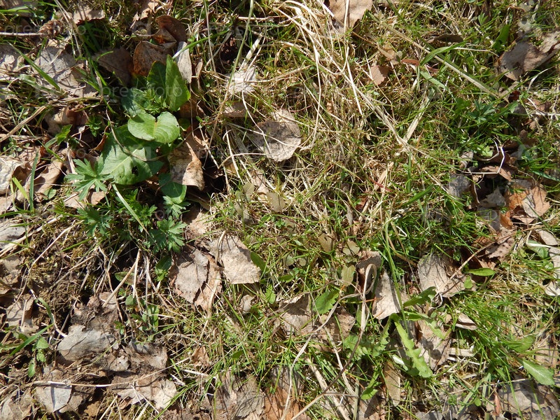 Сухая листва в осеннем лесу крупным планом. Зеленый клевер и трава