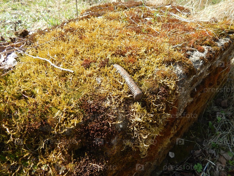 Большой камень, покрытый зеленым и желтым мхом, на лесной поляне в сухой желтой траве летним утром