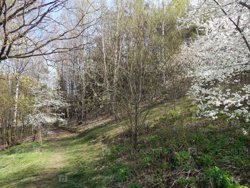 Цветение вишни в саду в апреле. Белые пушистые цветы, зеленая трава, весенний лес. лесная тропа