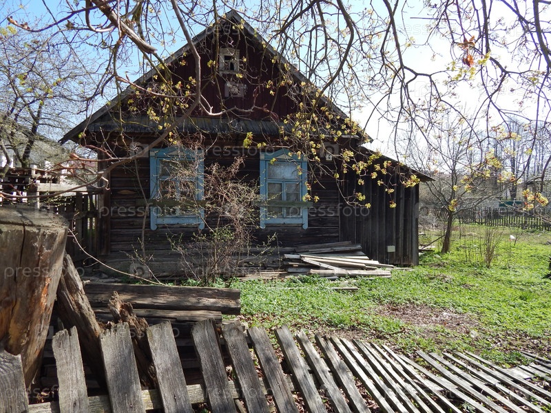 Старый ветхий деревянный дом с синими ставнями в деревне, скрытый за кустами и деревьями