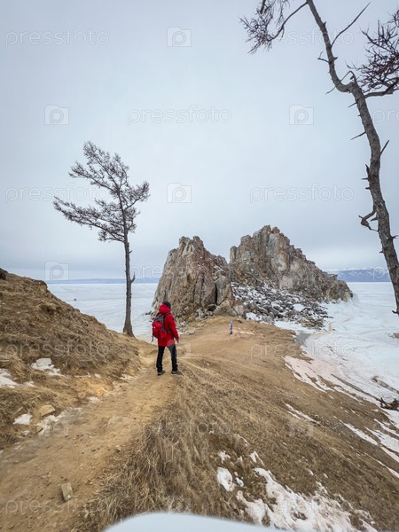 Мужчина в красной куртке идет по тропинке возле большого камня