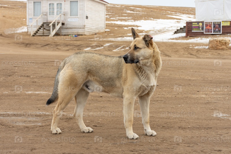 Собака стоит на грязном поле