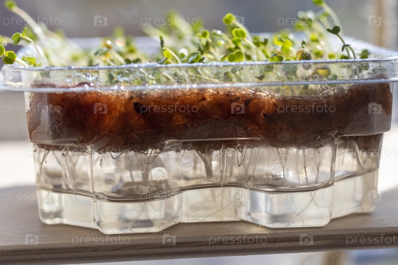 Свежепроросшие ростки микрозелени в пластиковом контейнере на джутовом коврике. Еда