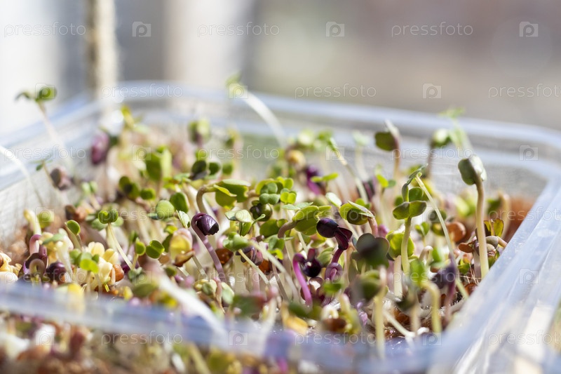Свежепроросшие ростки микрозелени в пластиковом контейнере на джутовом коврике. Еда