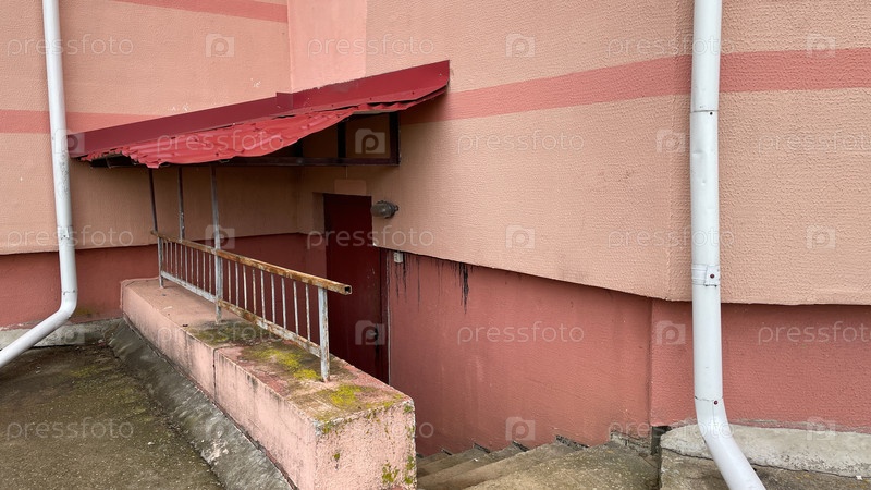 Старый розовый подвал с металлической дверью, черепичной крышей и черепицей на перилах, заброшенный дом