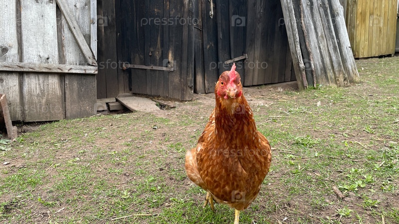 Курица стоит на травянистой местности. Курица коричневая и белая. Курица смотрит в камеру