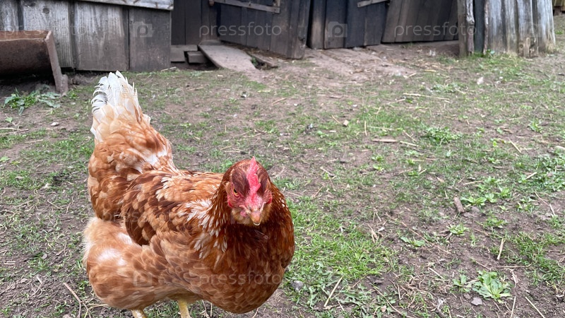 Курица стоит на травянистой местности. Курица коричневая и белая. Курица смотрит в камеру