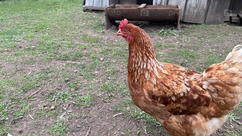 Курица стоит на травянистой местности. Курица коричневая и белая. Курица смотрит в камеру